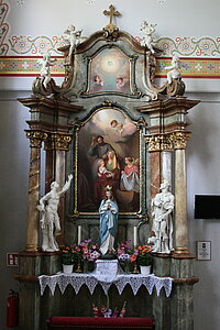 Das Altarbild von der Geburt Mariens wurde vom Maler Hemmerlein im Jahre 1853 gemalt und wird von den Statuen der Pestpatrone des Hl. Sebastian und des Hl. Rochus flankiert.