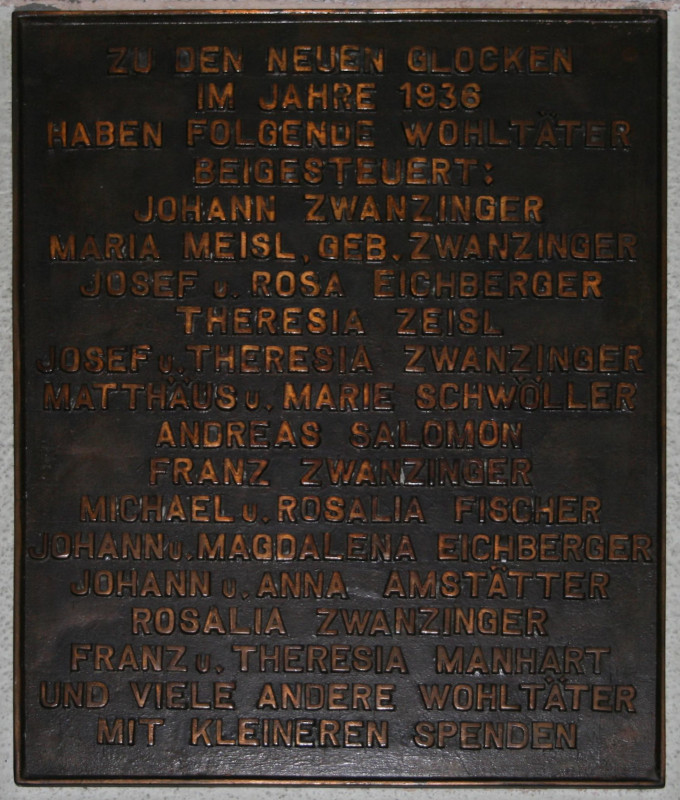 Am 25. Mai 1909 wurden 4 Glocken auf den Turm aufgezogen, leider wurden diese im 1. Weltkrieg wieder eingezogen. Im Jahre 1936 wurden abermals 4 Glocken mit Hilfe von gro?xzügigen Spenden angeschafft. Diese wurden im 2. Weltkrieg (Anfang 1942) abermals eingezogen. In der glockenlosen Zeit danach wurden die Stunden auf einer alten LKW-Felge geschlagen, die zur Erinnerung noch heute im Turm hängt. Nach dem 2. Weltkrieg konnten nur 3 Glocken (150, 250 und 650 kg) wieder errichtet werden, die Neuherstellung der grö?xten Glocke (1090 kg) konnte leider bis heute nicht realisiert werden.