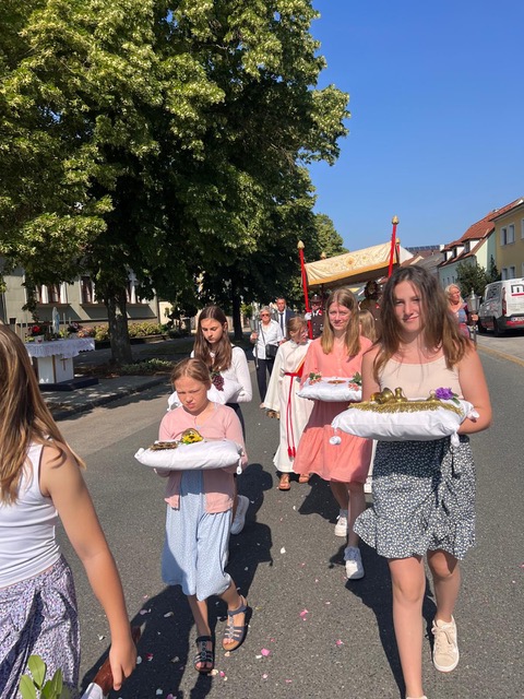 Wir tragen zu Fronleichnam eine große Hostie durch die Straßen und singen Lieder, segnen die Häuser und die Familien, alle Bewohner unserer Orte. Es ist nicht einfach ein Stück Brot, sondern das gewandelte Brot, der Leib Christi.