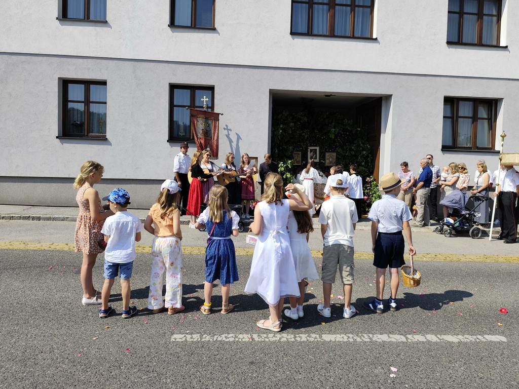 Das ist der Grund, warum wir dieses Fest feiern. Es wurde vor etwa 800 Jahren eingeführt, weil die hl. Juliana von Lüttich eine Vision hatte. Das erste Mal wurde Fronleichnam 1246 im belgischen Lüttich gefeiert und ist seitdem zu einem Fest geworden, das es in dieser Art nur in der Katholischen Kirche gibt. Der Hl. Juliana war es ein Anliegen, dass wir als Christen uns bewusst werden, dass Gott im gewandelten Brot gegenwärtig ist. Sie wollte durch ein schönes Fest zeigen, dass wir diese Freude genießen dürfen, dass Jesus real unter uns ist, geistig und leiblich in der Eucharistie. Nicht umsonst sagte Er: „tut dies zu meinem Gedächtnis“. Während der Prozession werden wir Evangelien hören, die dieses Wunder noch deutlicher machen: Er vermehrte die Brote und die Fische für die Menschen am See Genesaret. Er vergleicht die Freundschaft Gottes zu den Menschen mit einer Hochzeit. Schließlich zeigt der Hl. Johannes, dass Gottes Wort Mensch geworden ist: Am Anfang war das Wort.