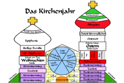 1. Unterweisung: Ministranten erhalten das Kirchenjahr (in der Form einer Kirche s. religion.schottengymnasium.at/patersebastian) s/w ausgedruckt, sie markieren die Feste mit den entsprechenden Farben