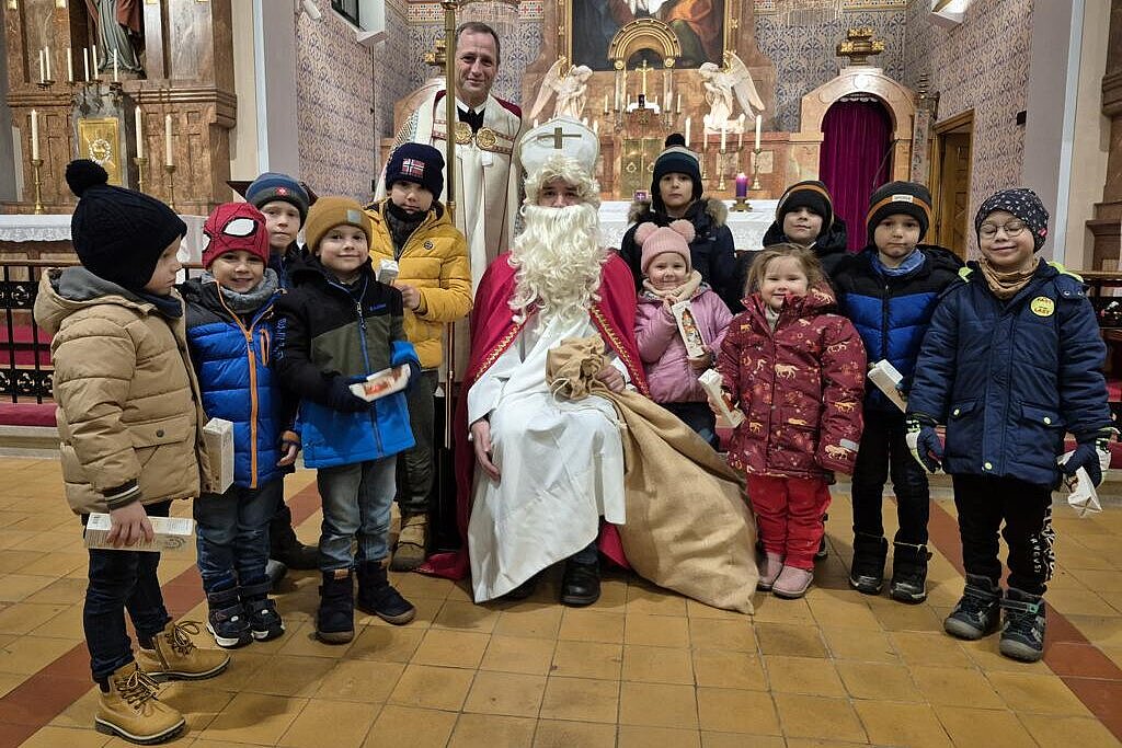 Die Kinder hören die Botschaft des Heiligen Nikolaus in der Pfarrkirche Enzersfeld
