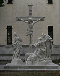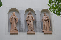 Über dem Hauptportal befinden sich die Statuen des Hl. Benedikt,