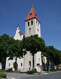 Die Kirchweihe fand am 5. September 1909 statt, der von weitem unübersehbare 41 m hohe Bau erinnert an romanische Kirchen, das besonders hohe, steile Dach über dem Kirchenschiff zieht unseren Blick zum Himmel.