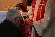 Seit dem 11. Jahrhundert wird der Blasiussegen mit zwei brennenden Kerzen, die in der Form des Andreaskreuzes gehalten werden, mit den Worten erteilt: