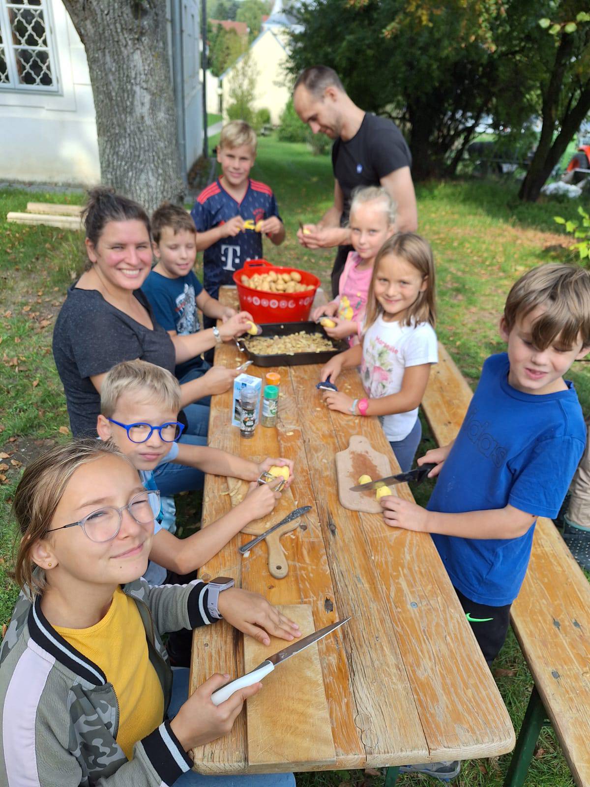 Sie bereiteten selbst das Essen zu - schälten Erdäpfel, schnitten die Würstel für das Kesselgulasch, das sie über dem Lagerfeuer kochten. Zwischen den Gesellschaftsspielen sangen sie gemeinsam und machten sich Gedanken zu den Fürbitten für die Familienmesse am nächsten Tag in der Pfarrkirche. Die Zelte im Pfarrhof stellten sie selbst auf.