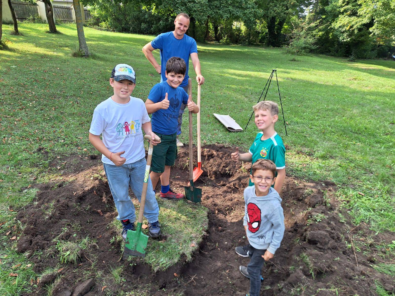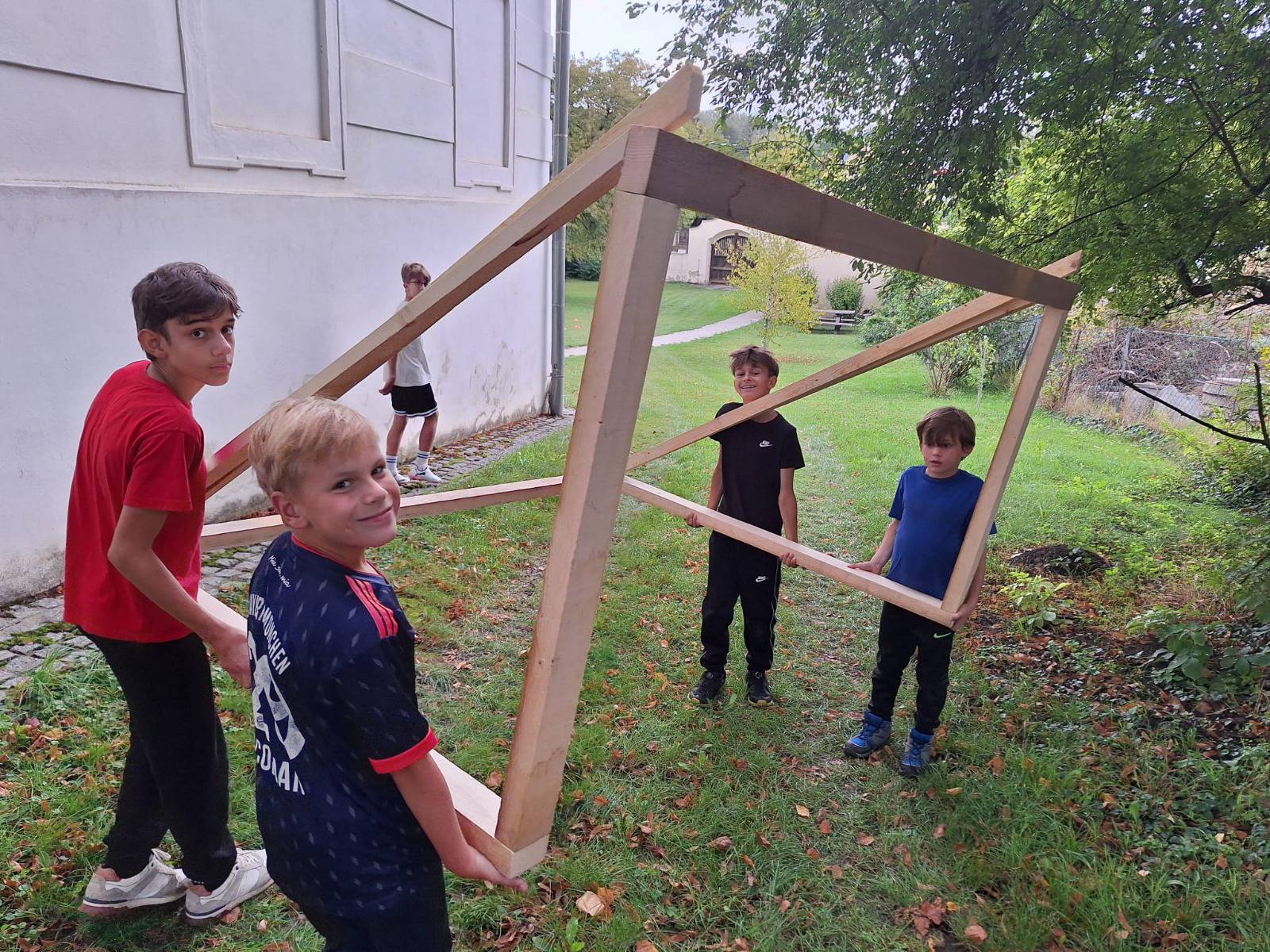 Sie nennen sich “Die Entdecker”, weil sie gemeinsam die Welt entdecken, als Schöpfung Gottes erleben und gestalten. Sie bauten mit Werkzeugen zwei Fußballtore, gruben eine Feuerstelle mitten im großen Garten, bastelten kleine Fahnen, die sie mit ihren Symbolen verzierten.