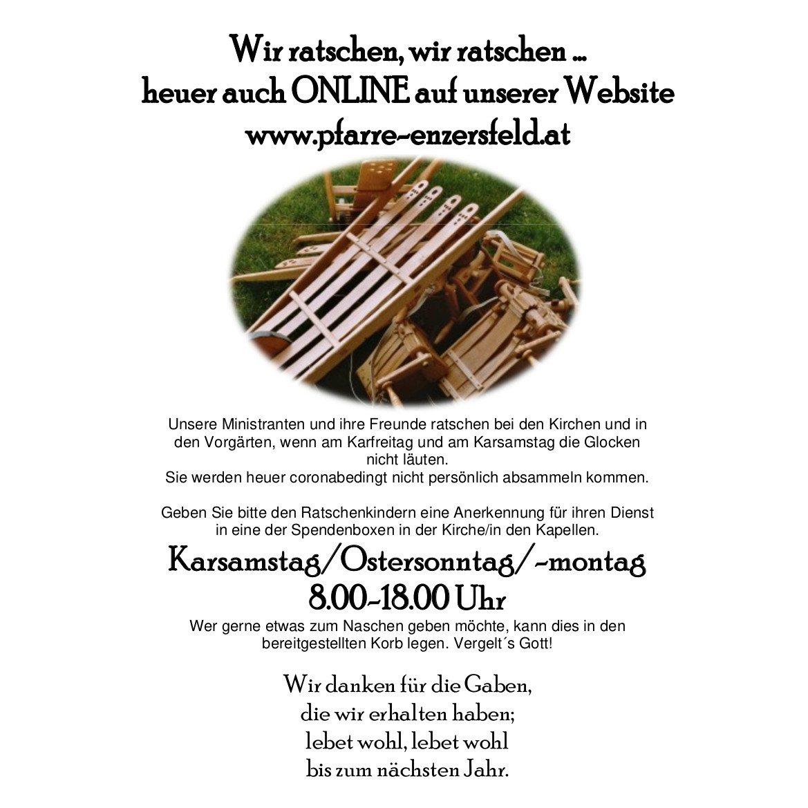 Unsere Ministranten und ihre Freunde ratschen bei den Kirchen und in den Vorgärten, wenn am Karfreitag und am Karsamstag die Glocken nicht läuten. Sie…