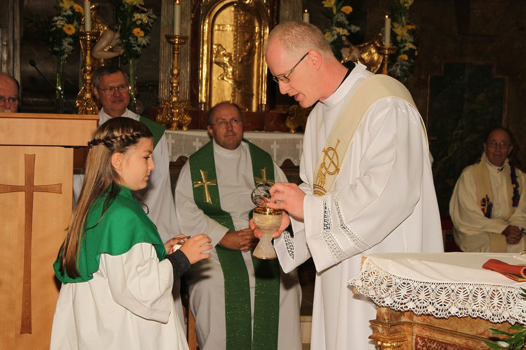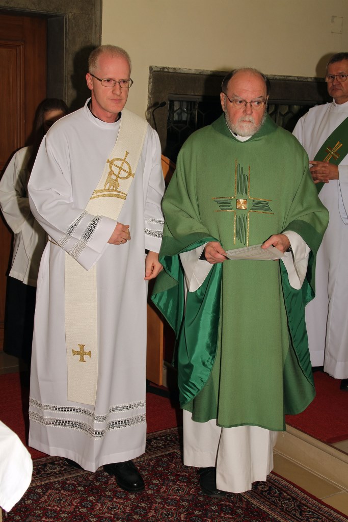Am Sonntag, dem 16. Oktober 2016, wurde unser neugeweihter Diakon Stephan Fuhs in sein Amt als ständiger Diakon in unserer Pfarre eingeführt. Begleitet wurde Stephan von seiner Familie und einem befreundeten Diakon, Walter Friedreich, der ebenso am Tag zuvor geweiht worden war. Nach dem Kyrie wurde ihm durch Pater Bonifaz das Geschenk der Pfarre, eine Festtagsstola, überreicht und angelegt.