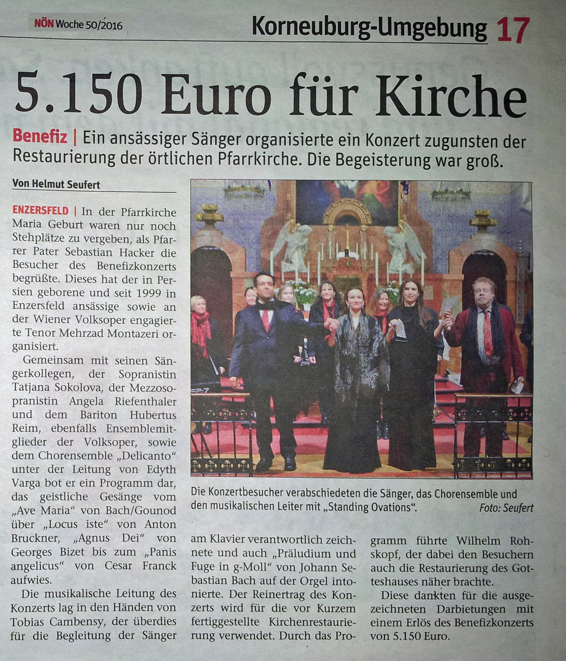 Die Kirche Maria Geburt Enzersfeld war bis auf den letzten Platz gefüllt: Zum Benefizkonzert am 11.12.16 anlässlich der Kirchenrenovierung waren über 400 Musikbegeisterte gekommen. Der Enzersfelder Volksoperntenor Mehrzad Montazeri und Musikerkollegen begeisterten mit geistlichen Liedern aus mehreren Jahrhunderten.