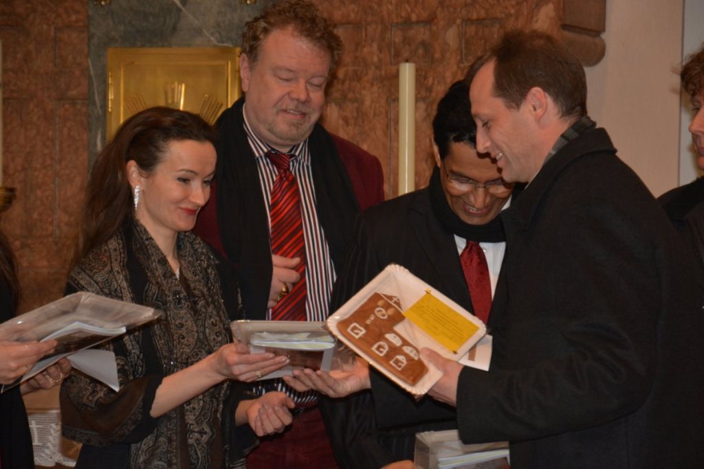 Als symbolisches Dankeschön erhielten die Musiker einen Lebkuchen in Form der Kirche. Die Backform wurde eigens nach dem Vorbild der Enzersfelder Kirche angefertigt. Zum Abschluss des Konzertes sangen die Musiker und die Besucher gemeinsam "Nun freut euch, ihr Christen!"