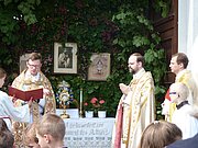 Am Fronleichnamstag, dem 26. Mai 2016 versammelten sich viele Gläubige im Pfarrhofgarten von Klein-Engersdorf. Dutzende Kinder waren besonders begeistert dabei, weil sie auf der Straße Blumen streuen konnten und während der Hl. Messe genug Platz im Garten hatten.