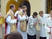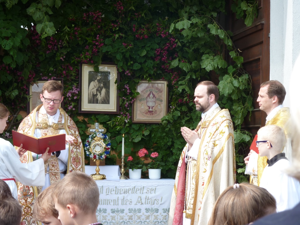 Besondere Gäste der Fronleichnamsfeier waren Hw. Klemens Schubert und Hw. Johannes Paul Kienemund, die erst kurz davor, am 15.5., in ihren Heimatdiözesen Magdeburg und Erfurt die Priesterweihe empfangen hatten. Beide kennen unsere Pfarre, weil sie hier in der Karwoche bzw. zu Fronleichnam schon als Studenten während ihrer Freisemester in Wien an der Liturgie teilgenommen hatten. Sie wohnten damals in der Studentenwohngemeinschaft im Schottenstift.