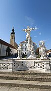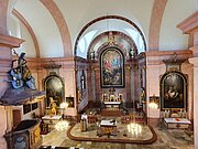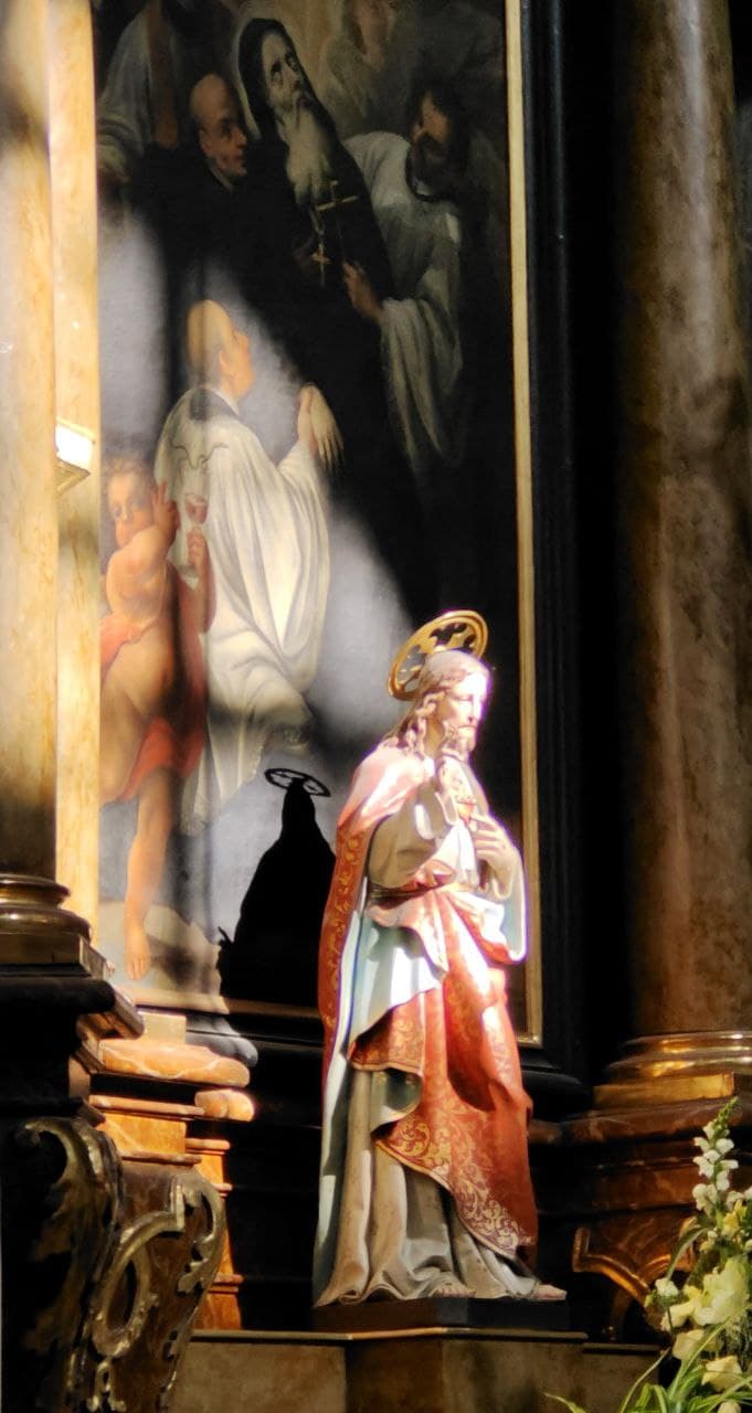 Die Wallfahrer brachen am Vormittag nach Karnabrunn auf. Dort feierten sie die Hl. Messe in der Dreifaltigkeitskirche, die im 17. Jh. nach einer Pestwelle aufgrund eines Gelübdes errichtet worden war. Romana Schmid begleitete die Pilger auf der Orgel. Hw. Bojanowski ging in seiner Predigt auf das Beispiel des Hl. Franziskus ein, der alles aufgab, um Gott nahe zu sein. Der aktuelle Ausfall von sozialen Netzwerken inspirierte ihn zu diesen Gedanken, weil der gezielte Verzicht auf Medien ein Fenster zu Gott und zum Nächsten öffnen kann. Nach dem Mittagessen brachen die Pilger nach Gaweinstal auf, eine dem Schottenstift inkorporierte Pfarre, wo sie Dechant P. Anton Erben OSB in "seiner" Kirche begrüßte. Die Kirche ist dem Hl. Georg geweiht und wurde vor etwa 300 Jahren errichtet. Seit dem 13. Jh. gehört sie in den Verantwortungsbereich des Schottenstifts ("inkorporiert").