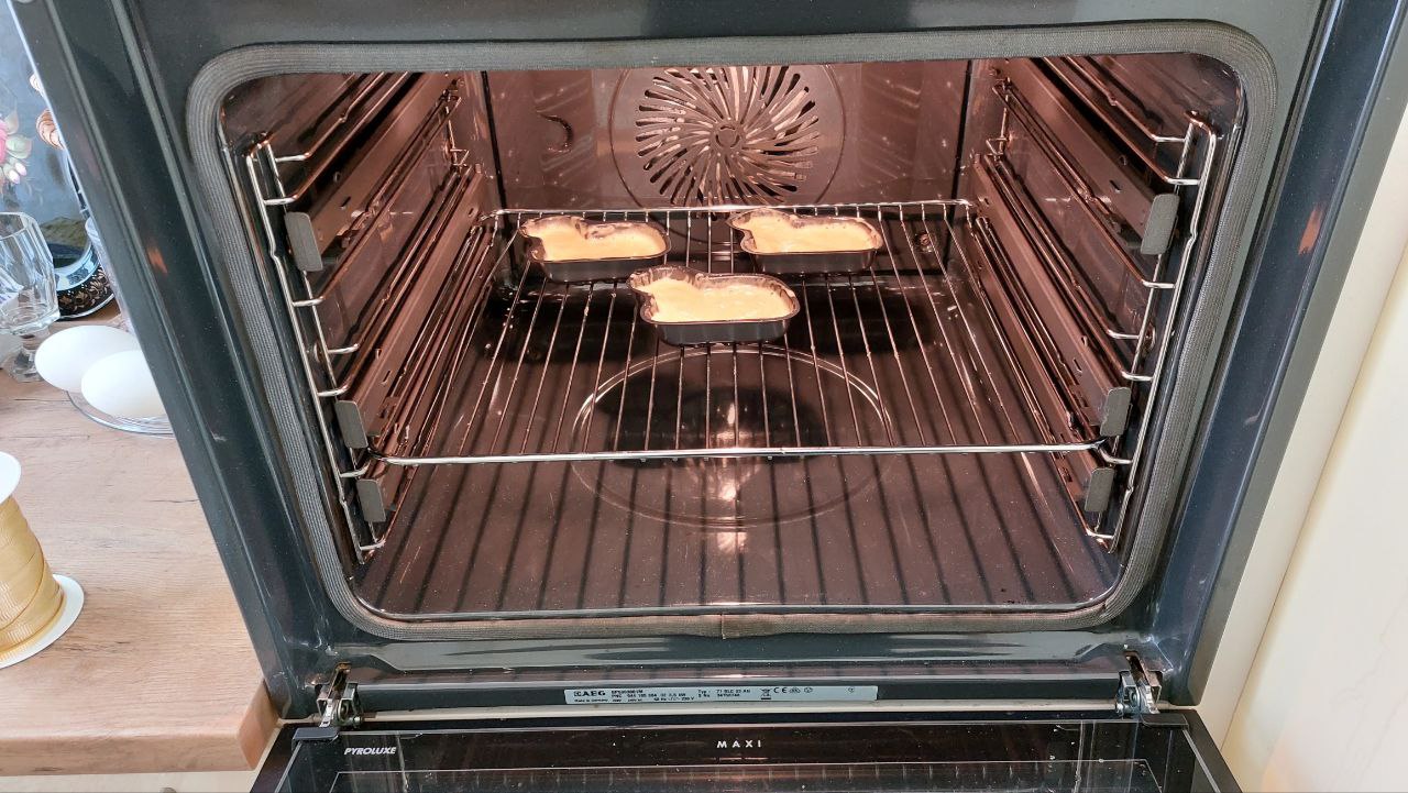 Die Formen müssen mit Butter ausgestrichen werden ("Wer gut schmiert, fährt gut") und werden am Rand höher, in der Mitte tiefer gefüllt. Den Rand mit dem Löffel hinaufstreichen. Backen bei 200 Grad Ober-/Unterhitze 12-15min.